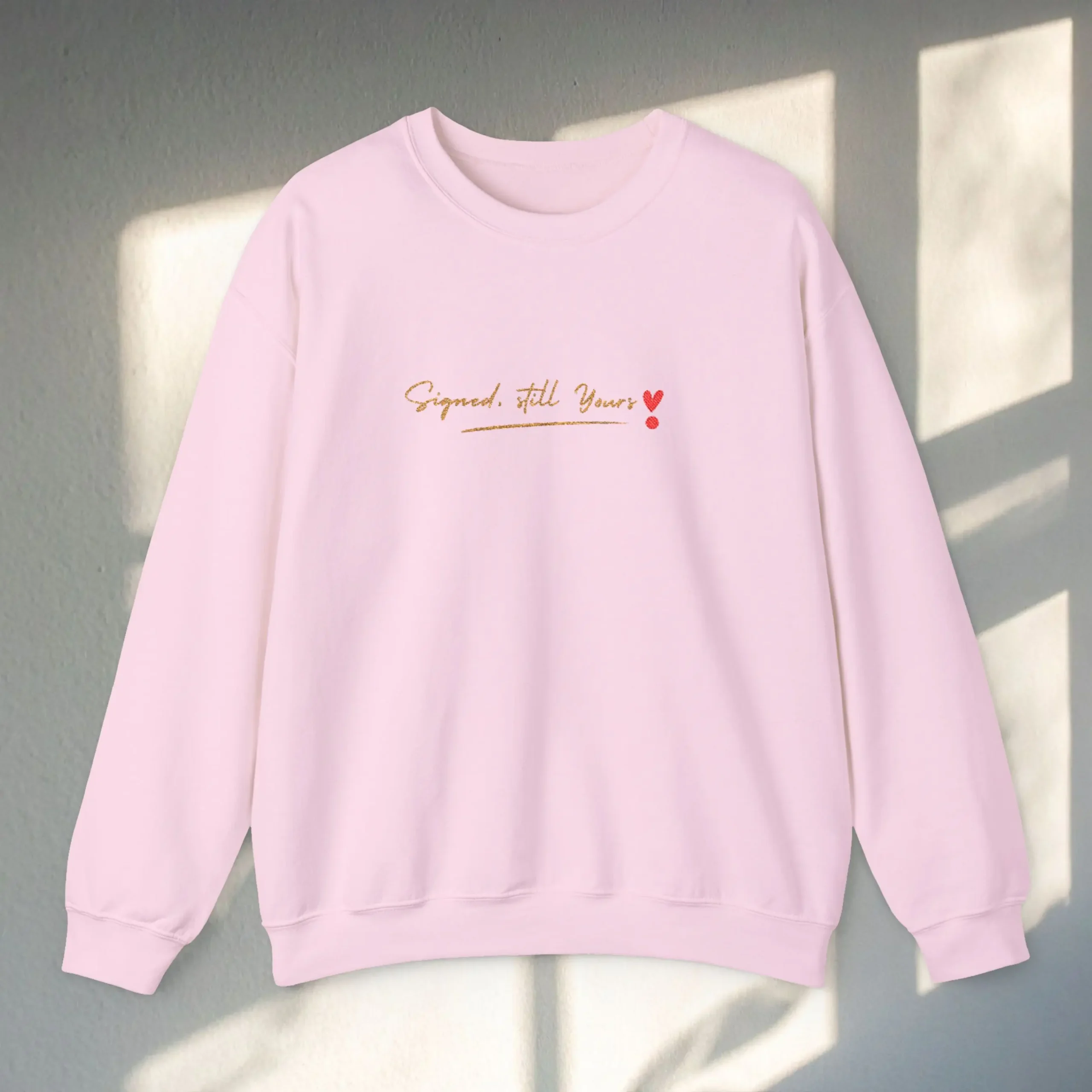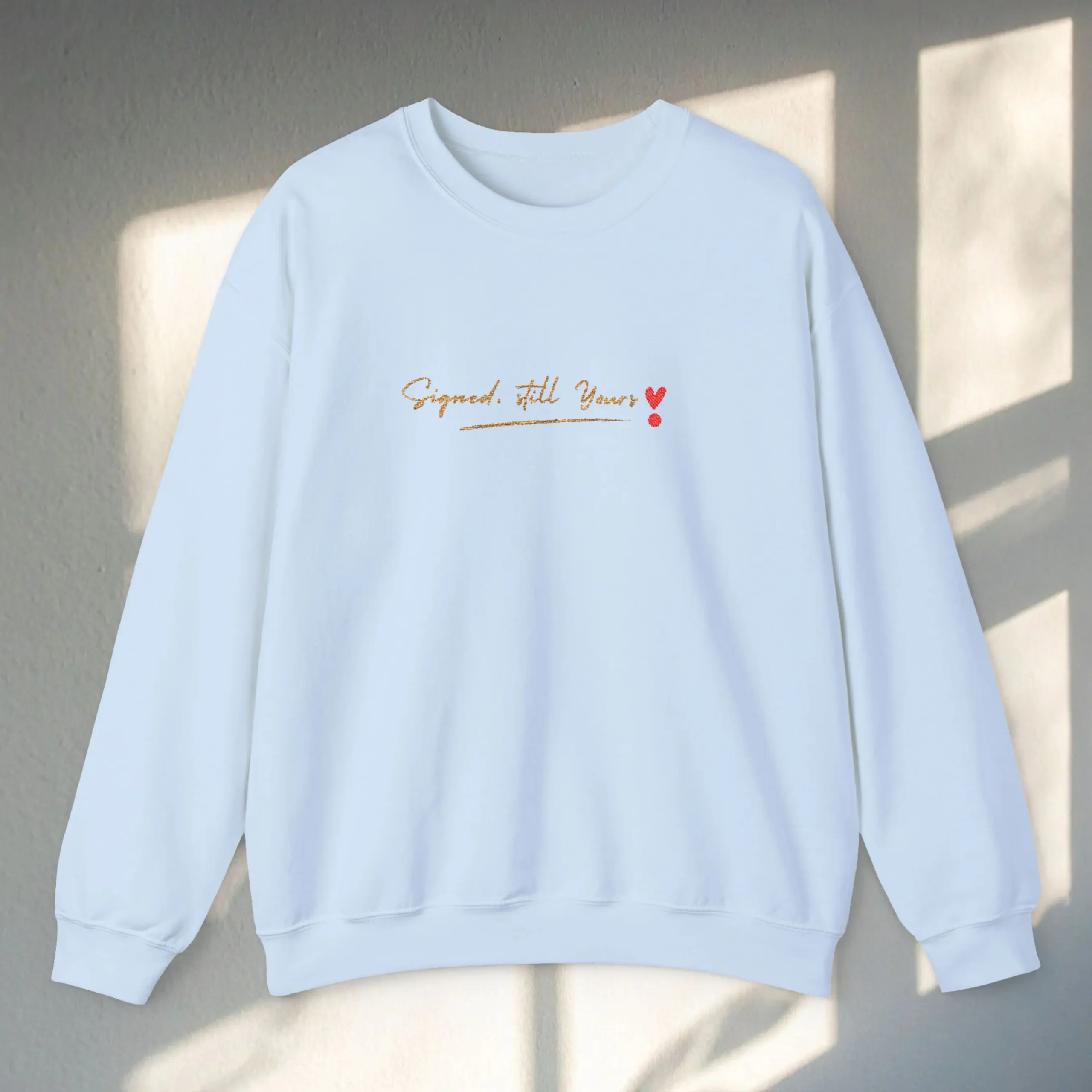 The Signed Still Yours embroidered sweatshirt by Bhoomkins captures that soft ache of love and longing. Featuring delicate embroidery on the Gildan 18000, this piece is made for those who adore subtle storytelling and heartfelt detail.
